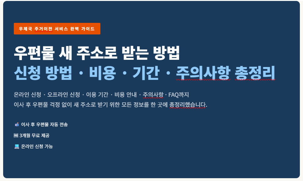이사 후 정신없는 와중에도 우체국 주거이전 서비스만 먼저 신청해두면, 중요한 우편물을 놓칠 걱정을 훨씬 줄일 수 있습니다.